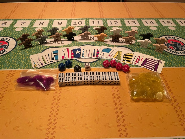 Derby Challenge includes 250 wagering chips, in two colors. These wagering chips are used to pay out the top three finishers. Multiple races are run and a winner of the game is determined by the final wager chip count.